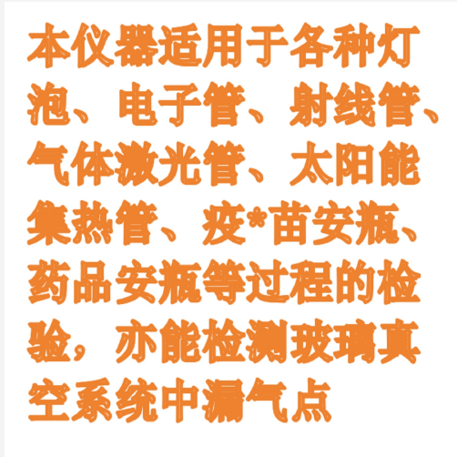 本儀器由高壓變壓器和高頻振蕩發射器組成,利用高頻電火花檢測玻璃真空器件和玻璃系統的真空程度,適用于各種燈泡、電子管、射線管、氣體激光管、太陽能集熱管、疫*苗安瓶、藥品安瓶等過程的檢驗,亦能檢測玻璃真空系統中漏氣點。