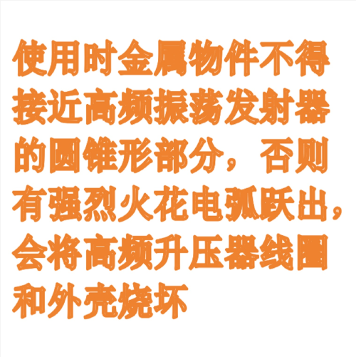1.使用時金屬物件不得接近高頻振蕩發射器的圓錐形部分,否則有強烈火花電弧躍出,會將高頻升壓器線圈和外殼燒壞。