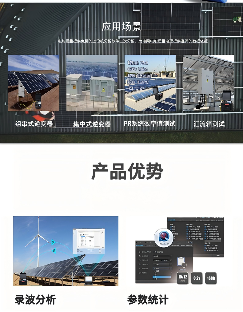 伏準計量光伏電能質量測試儀廣泛應用于光伏電站的并網驗收、定期電能質量評估、故障診斷及合規性驗證等關鍵環節,為運營單位提供可靠的電能質量數據支撐,是保障電網安全穩定運行、提升電站并網品質與運營效益的專業化測試工具。
